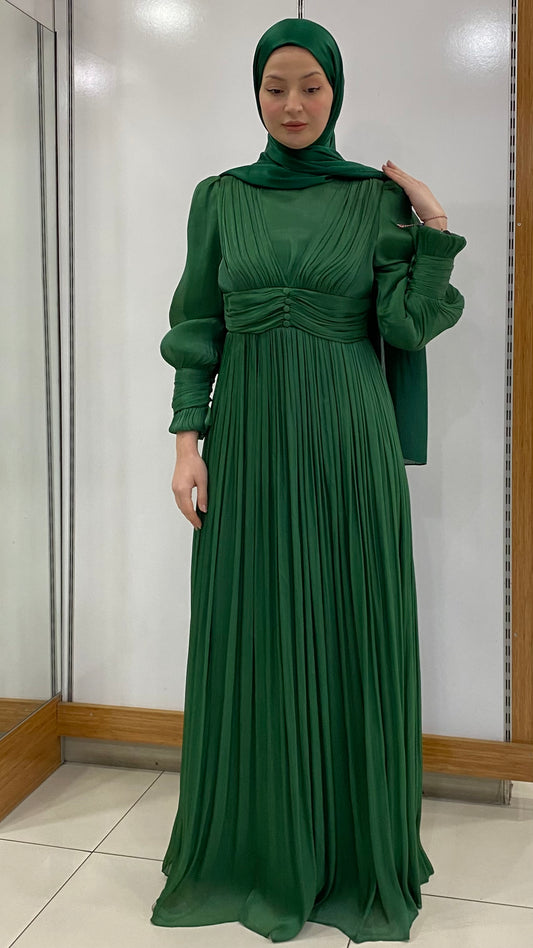 Önü Düğme Detaylı Kolu Manşetli Abiye Zümrüt Yeşili