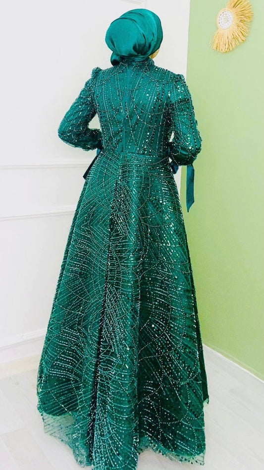 Tarlatanlı Tamamı İnci İşlemeli Abiye Yeşil