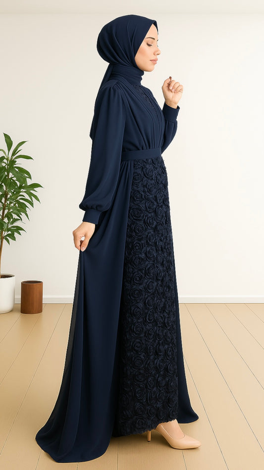 Önü Gül Detaylı Pelerinli Abiye Lacivert