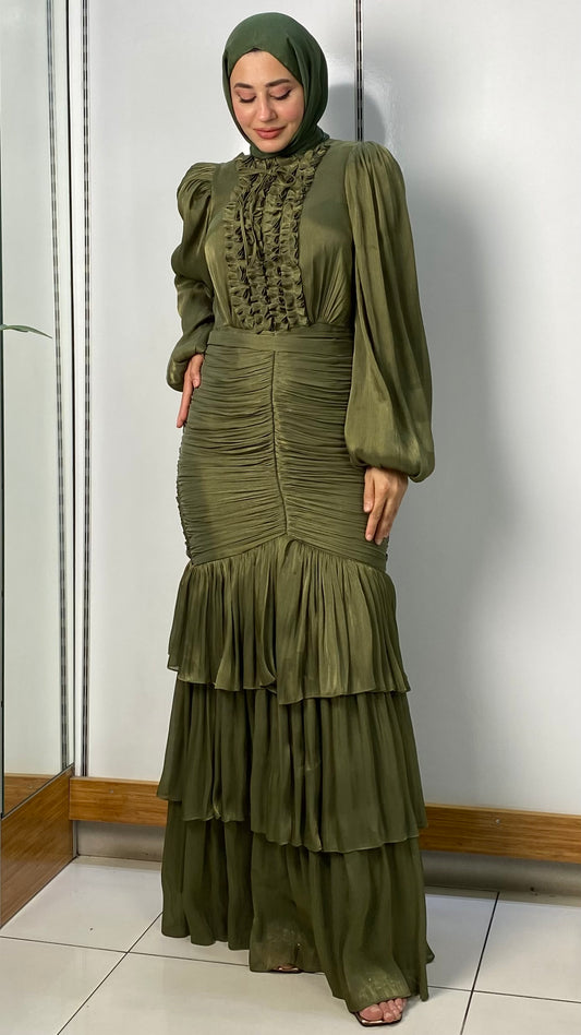 Önü Fırfır ve Kat Kat Model Abiye Yeşil