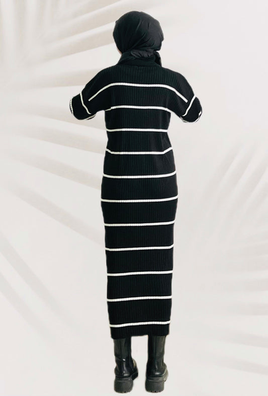 Çizgi Desenli Yarım Boğaz Fermuarlı Triko Elbise Siyah