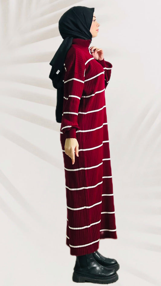 Çizgi Desenli Yarım Boğaz Fermuarlı Triko Elbise Bordo