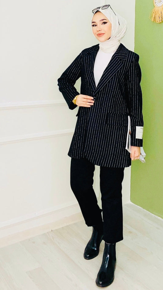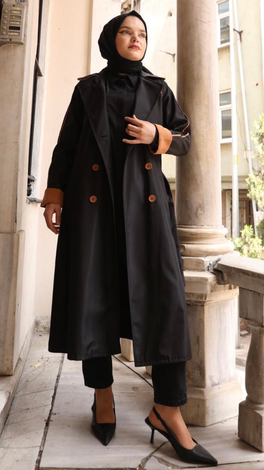 Çizgi ve Düğme Detaylı Trenç Siyah