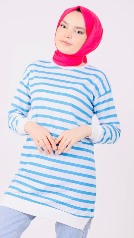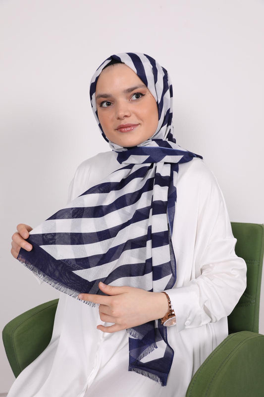 Çizgi Desenli Yarım Boğaz Fermuarlı Triko Elbise Lacivert