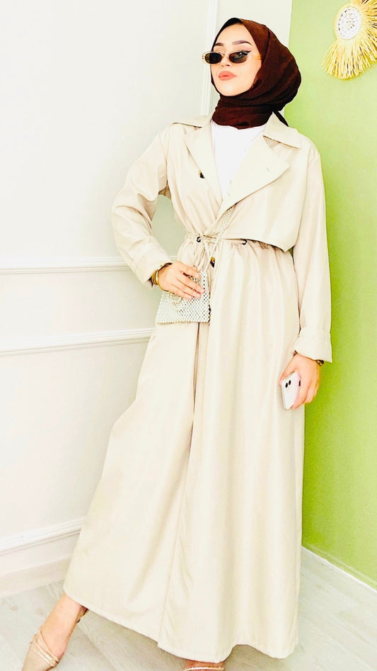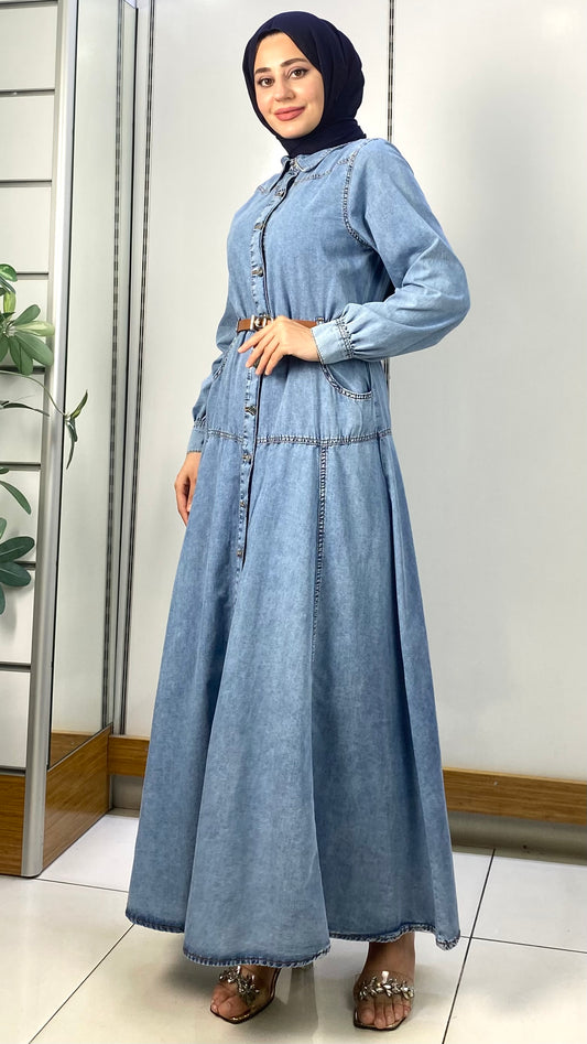 Tam Boy Düğmeli Kemerli Kot Elbise Açık Mavi