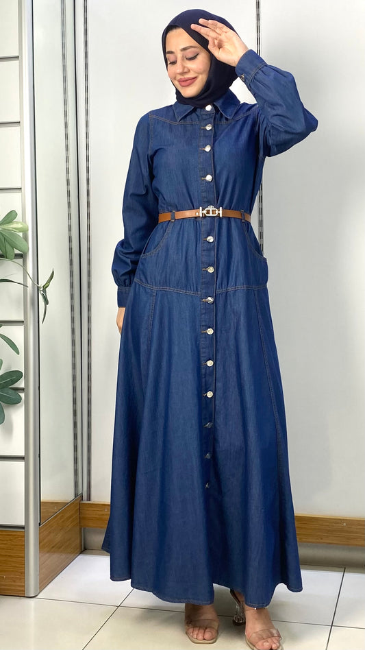 Tam Boy Düğmeli Kemerli Kot Elbise Lacivert
