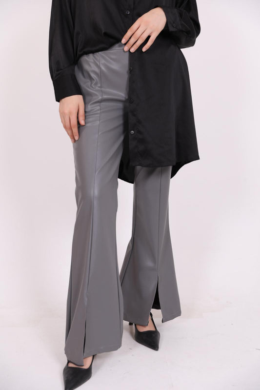 Yırtmaçlı Deri İspanyol Pantolon Gri