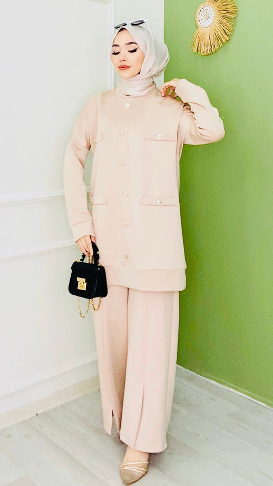 Yakası Taşlı Kuşaklı İkili Takım Bej