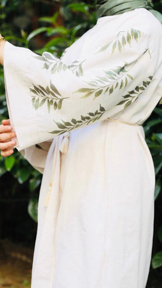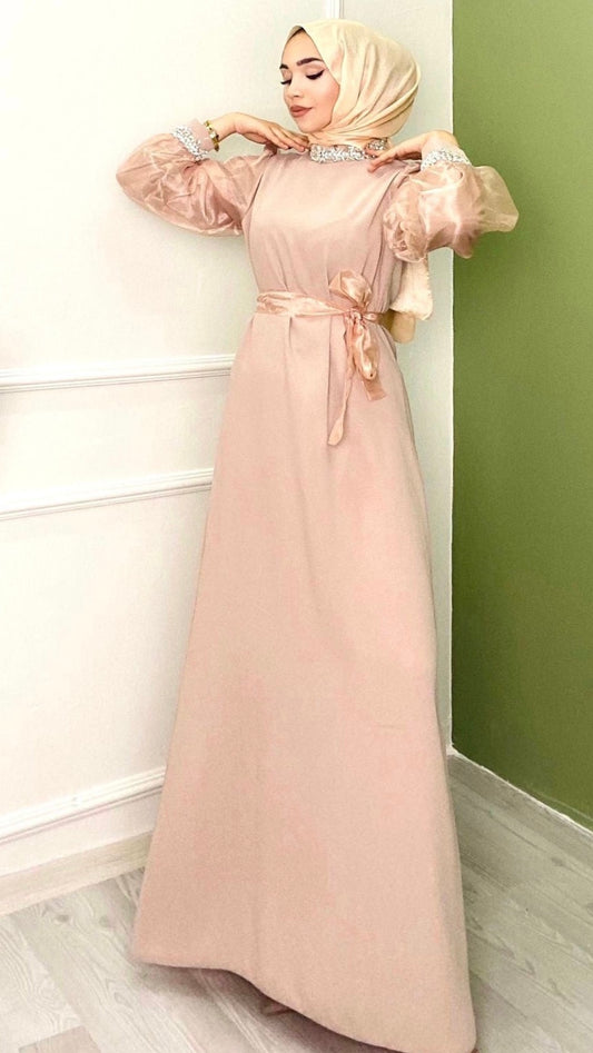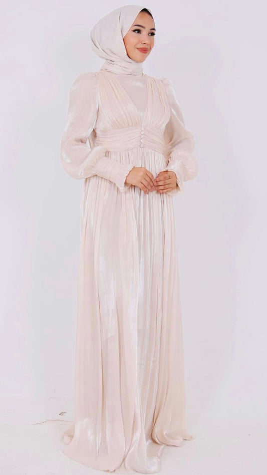 Önü Düğme Detaylı Kolu Büzgülü Abiye Bej
