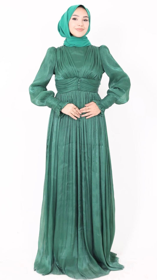 Önü Düğme Detaylı Kolu Büzgülü Abiye Yeşil