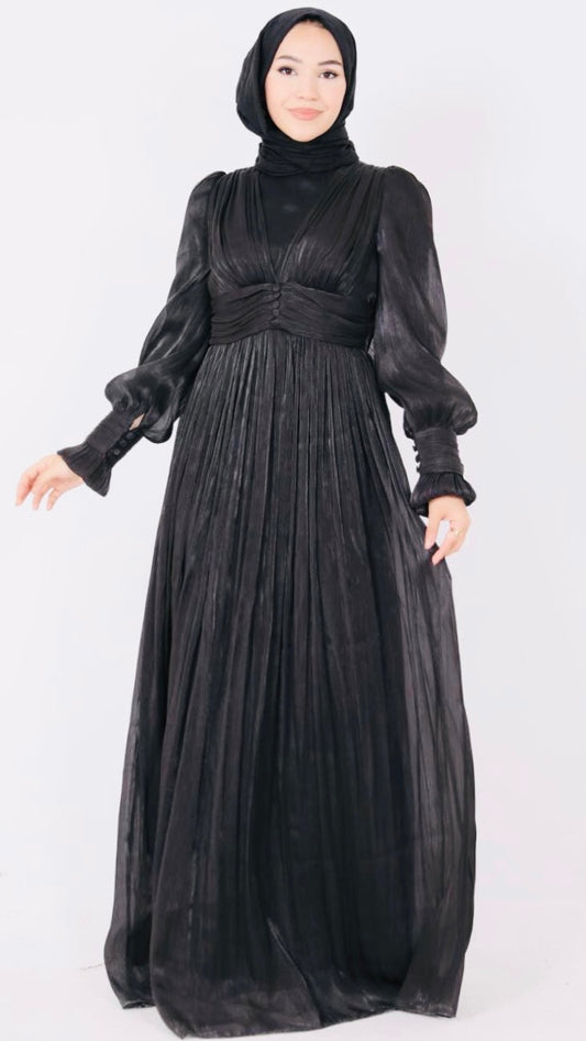 Önü Düğme Detaylı Kolu Büzgülü Abiye Siyah