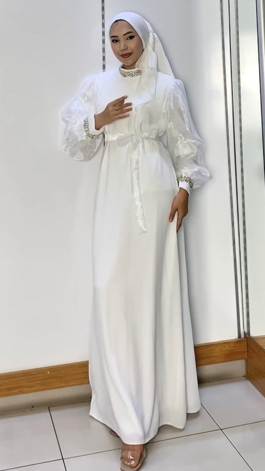Organize Kol Yaka ve Bilek Taşlı Abiye Beyaz