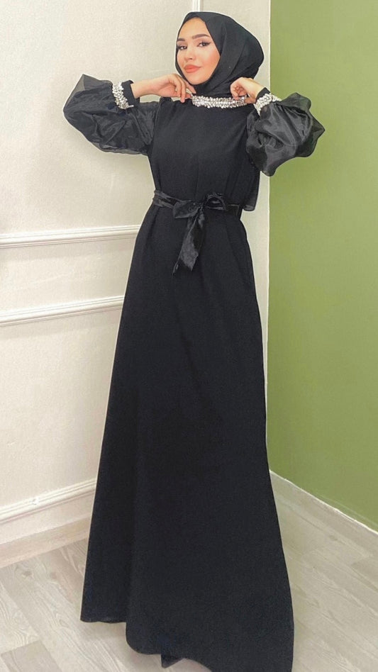 Organize Kol Yaka ve Bilek Taşlı Abiye Siyah