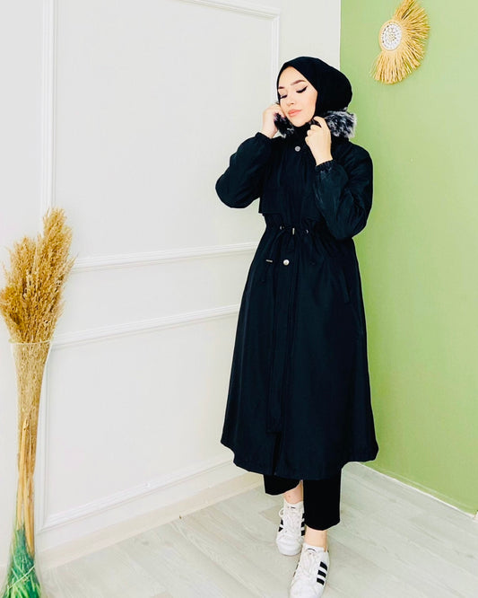 Çizgi Desenli Kuşaklı ve Astarlı Kaban Siyah