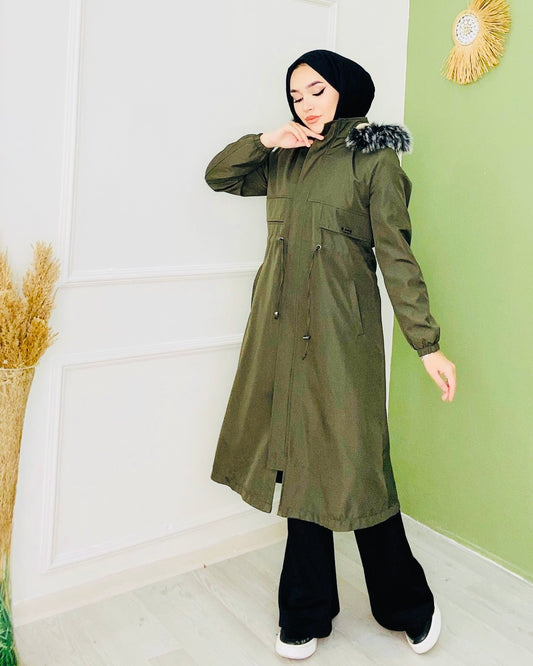 Çizgi Desenli Kuşaklı ve Astarlı Kaban Mavi