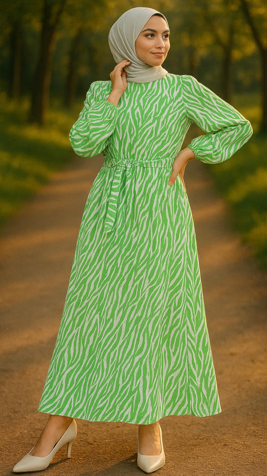Zebra Desen Beli Lastikli Viskon Elbise Yeşil
