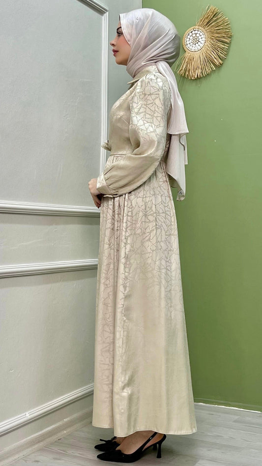 Önü Düğmeli ve Yandan Bağlamalı Varanglı Elbise Bej