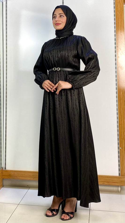 Boğazı Taşlı Beli Lastik ve Kemerli Elbise Siyah