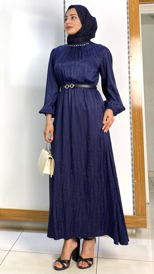 Boğazı Taşlı Beli Lastik ve Kemerli Elbise Lacivert