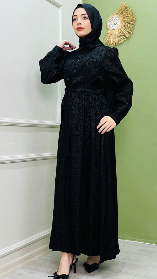 Önü Düğmeli ve Yandan Bağlamalı Varanglı Elbise Siyah