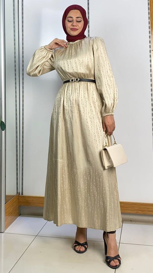 Boğazı Taşlı Beli Lastik ve Kemerli Elbise Bej