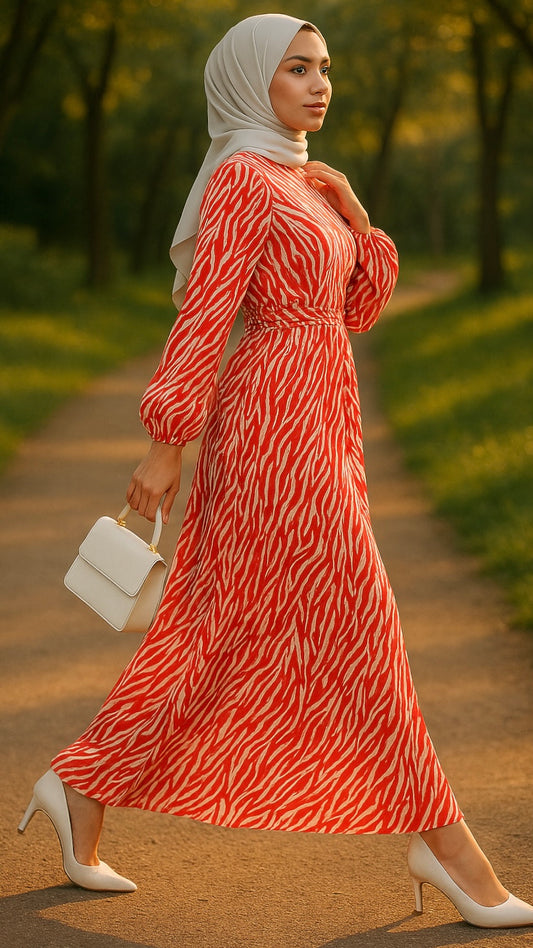 Zebra Desen Beli Lastikli Viskon Elbise Turuncu