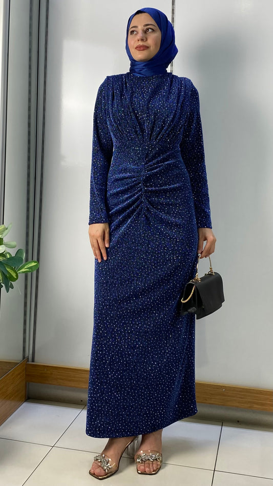Sold outÖnden Büzgü Detaylı Simli Abiye Mavi