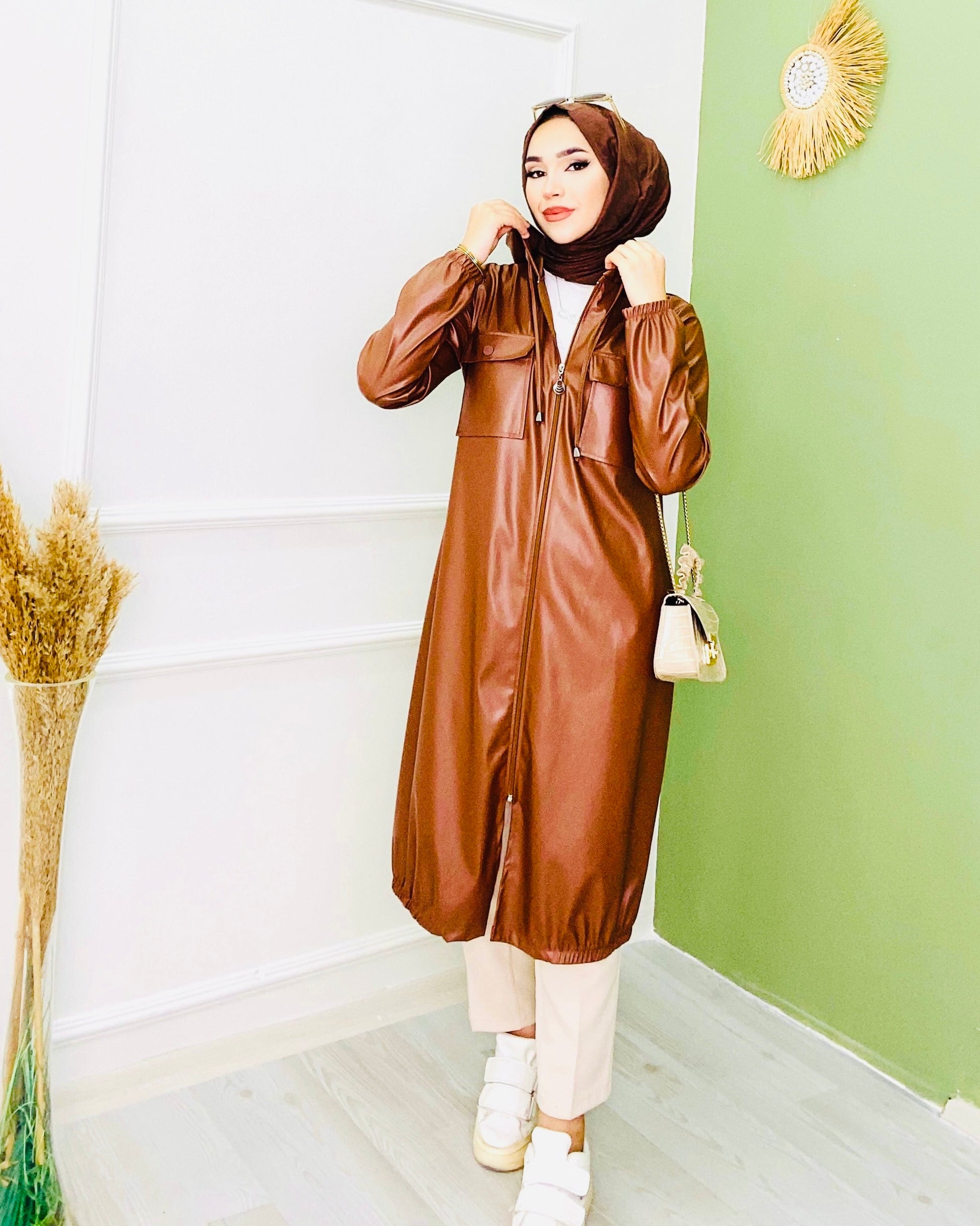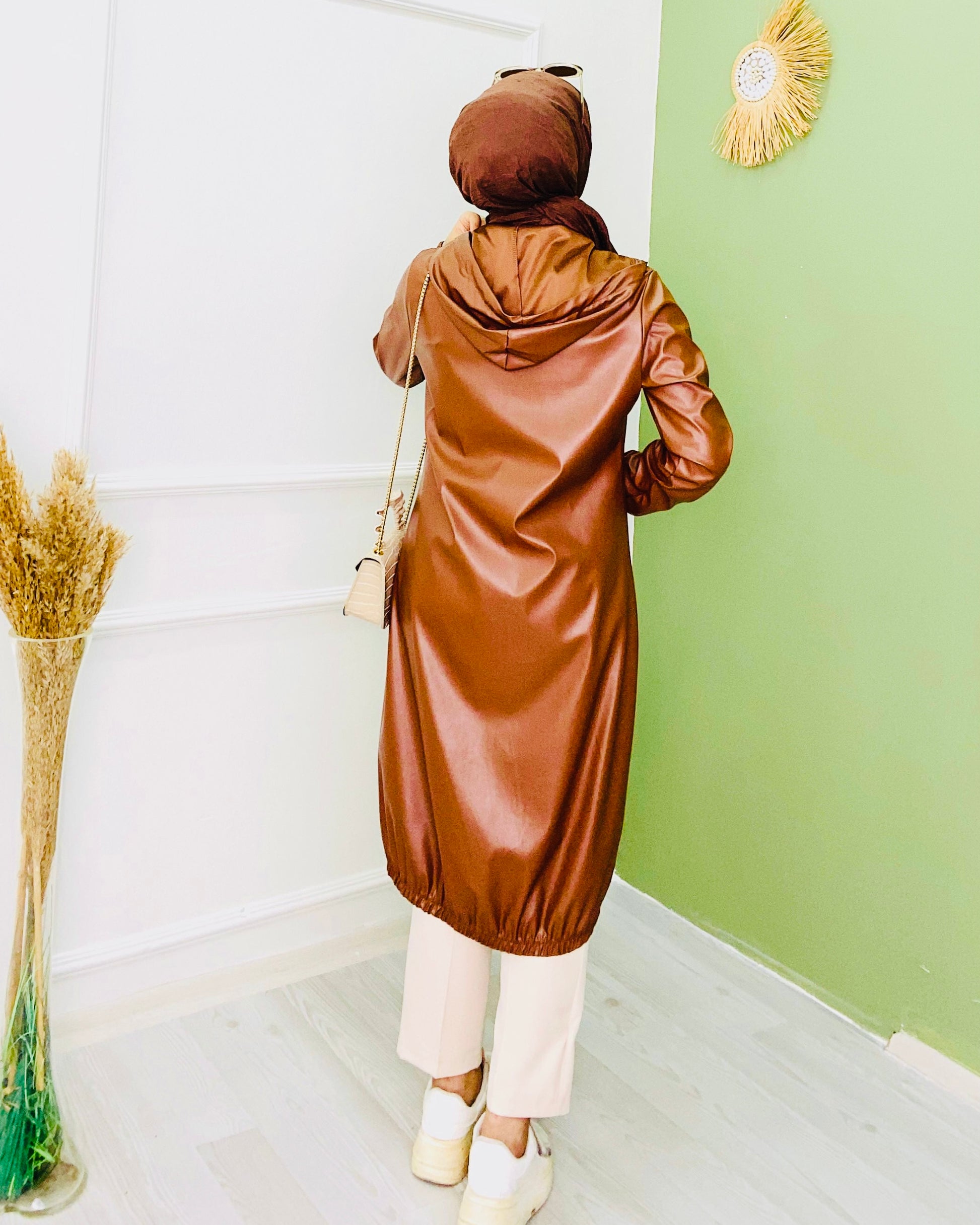 Kapşonlu Fermuarlı Deri Trenç Kahve