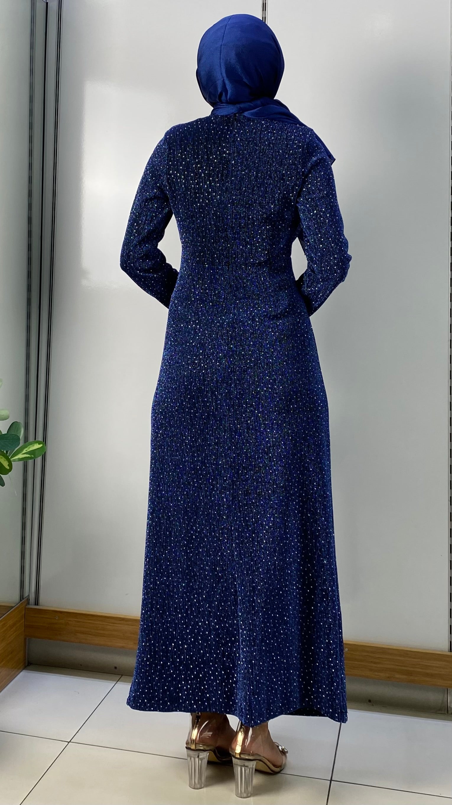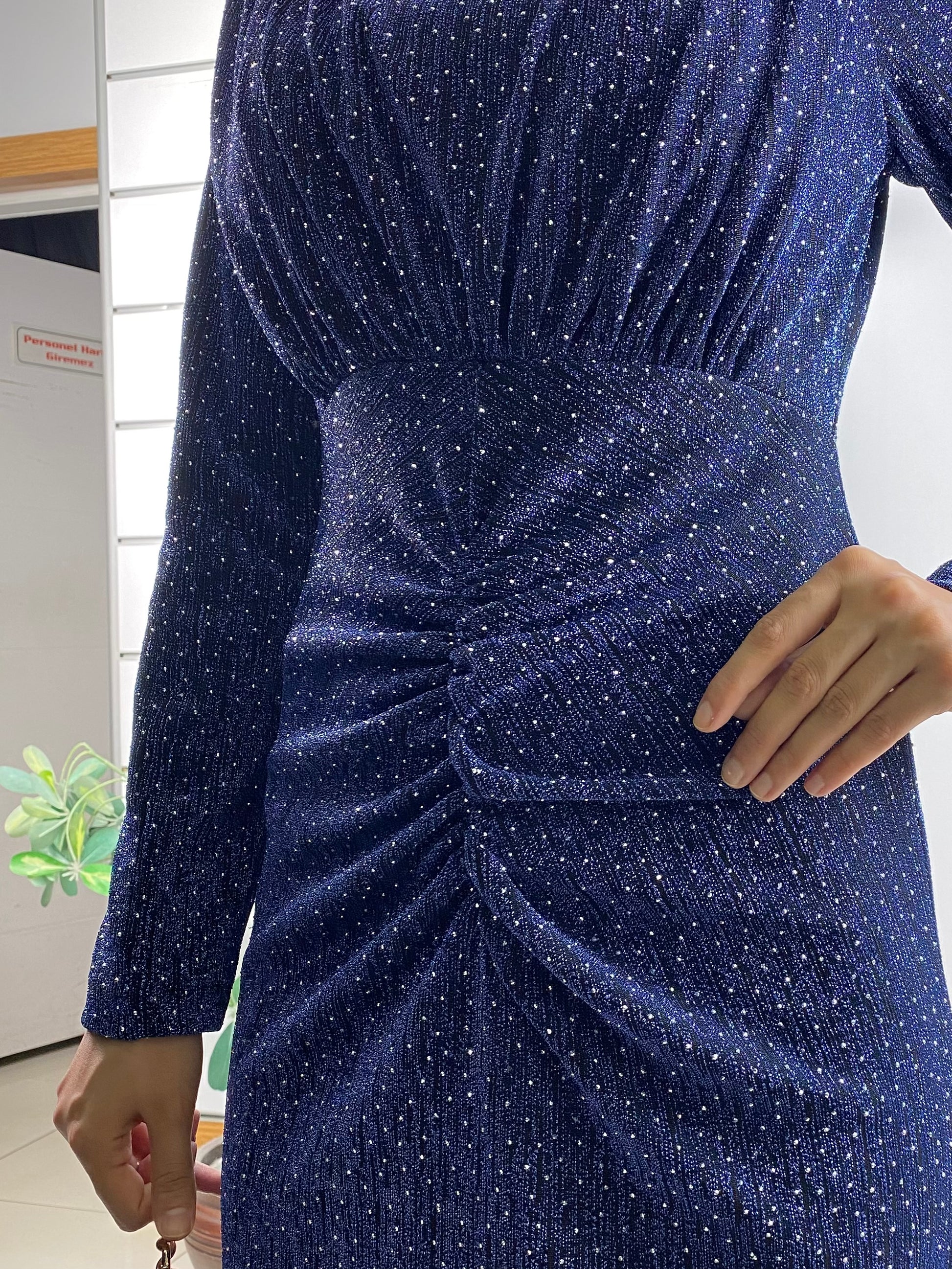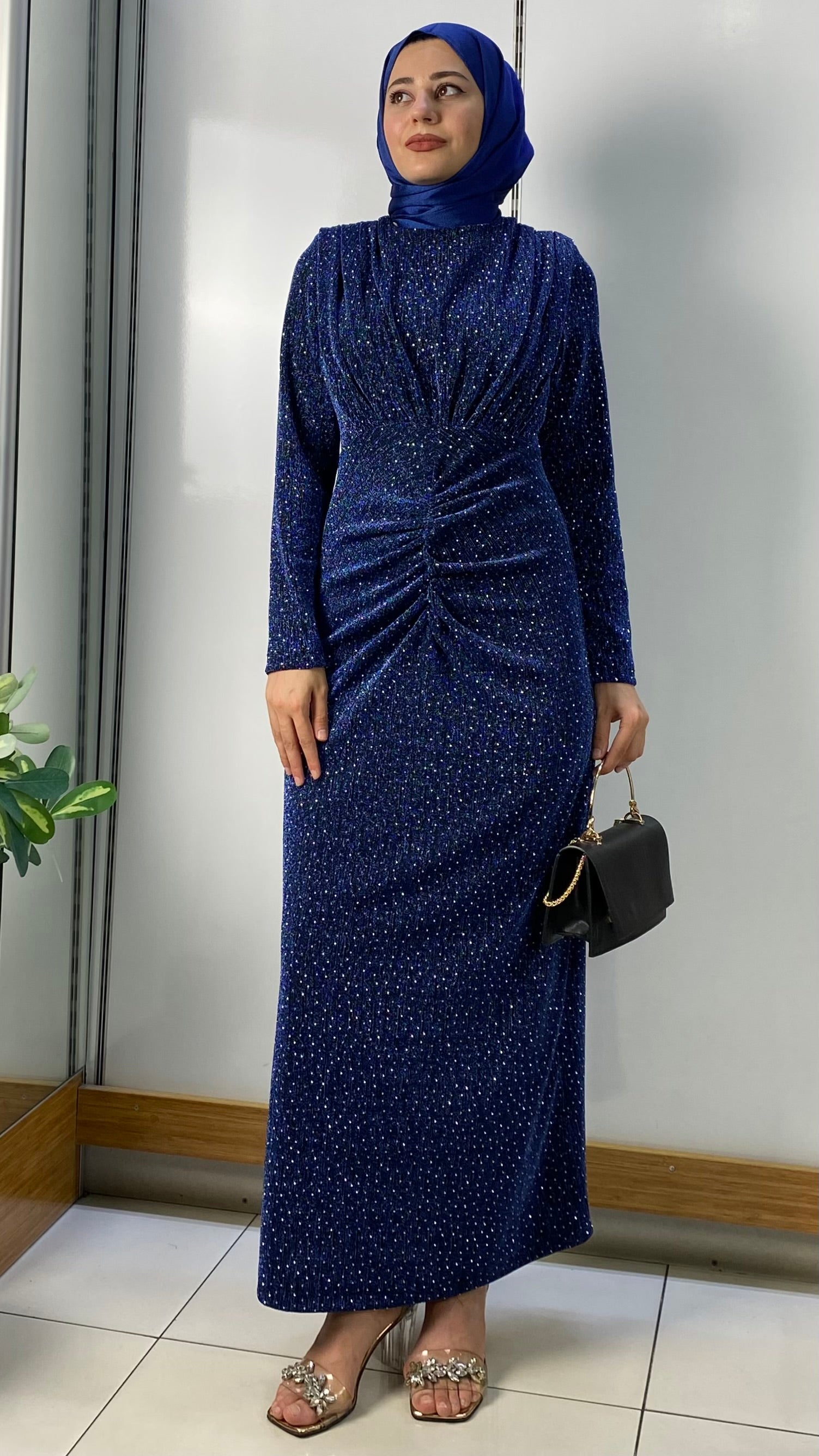 Önden Büzgü Detaylı Simli Abiye Mavi