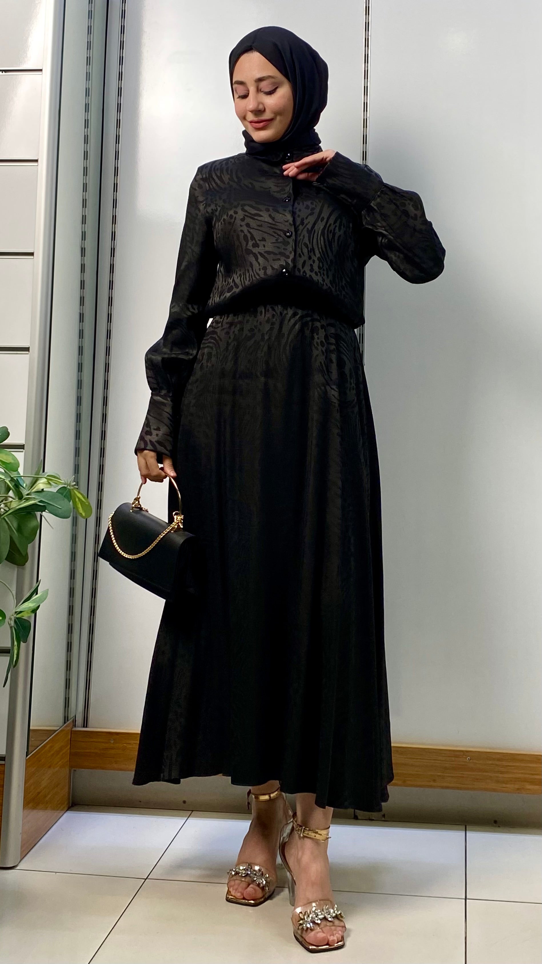 Önden Düğmeli Varanglı Etekli Takım Siyah