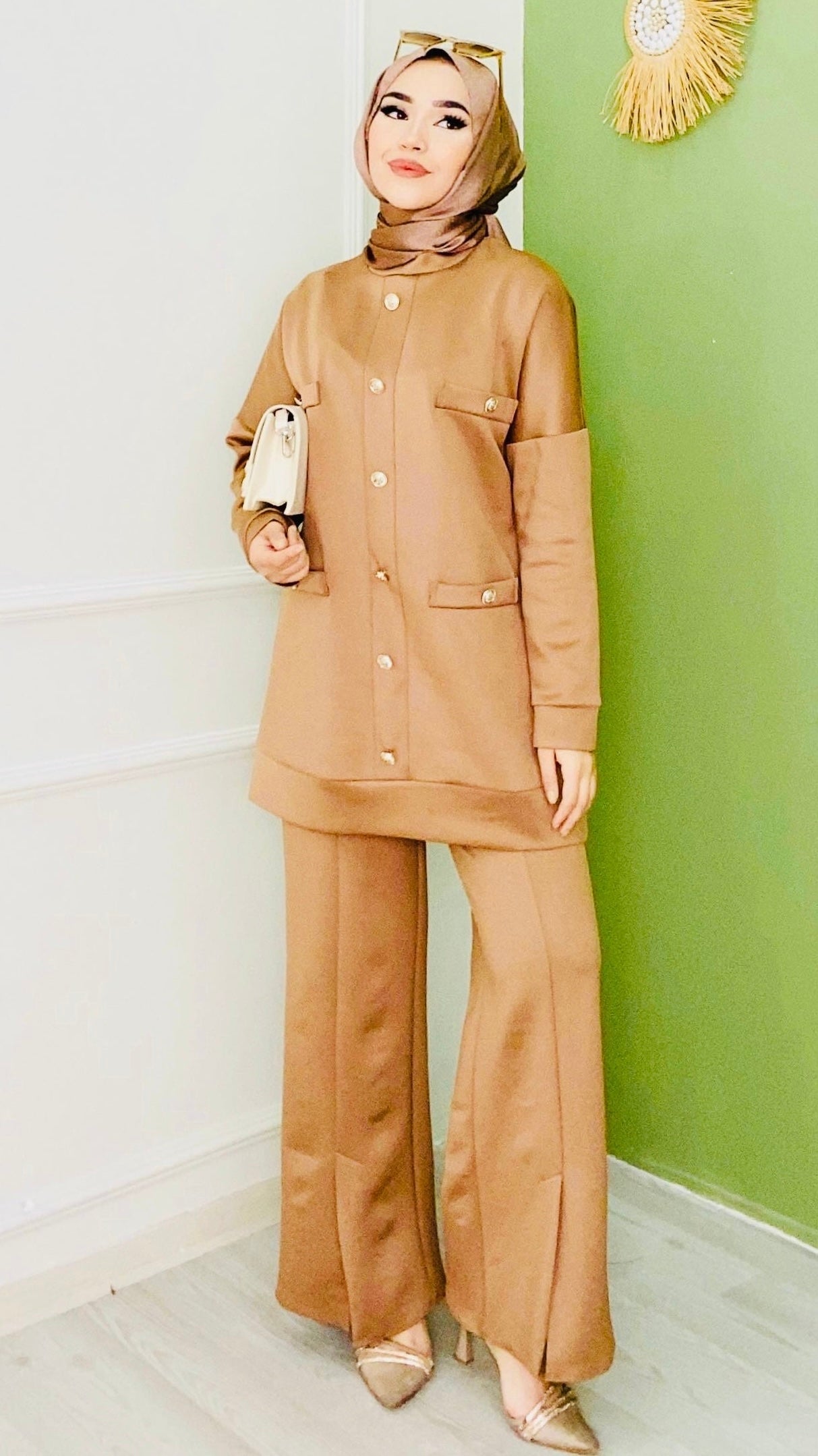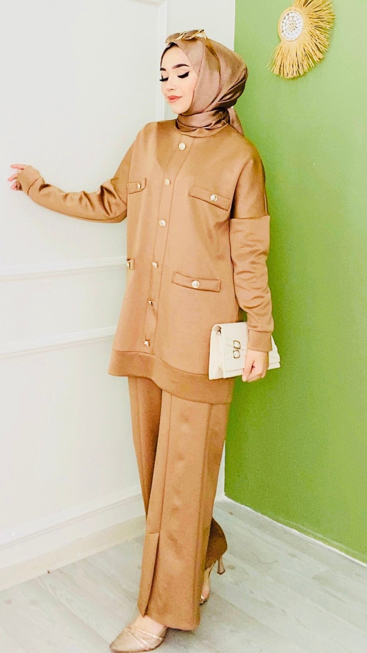 EDİTÖRÜN NOTU: Paçası Kesik Düğme Detaylı Takım Özel Düğme detaylı Olup Aksesuar Cep ModelliYaka Kol bilek ve Etek Ucları Kısa Manşet Modellidir Pantolonu İse beli Lastikli Olup Paçası Yırtmaçlıdır Kumaşı İse Yumuşak Dokuya Sahiptir