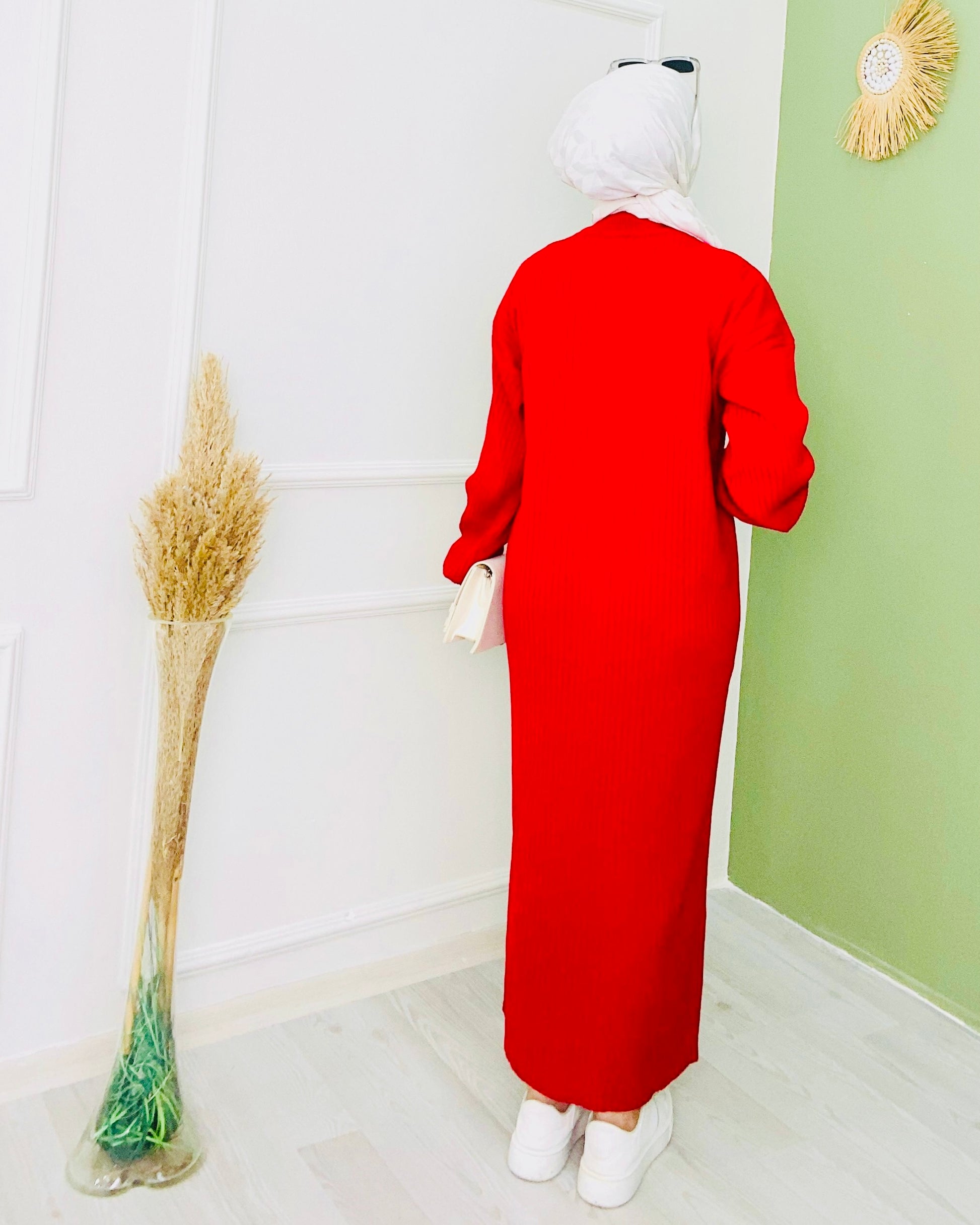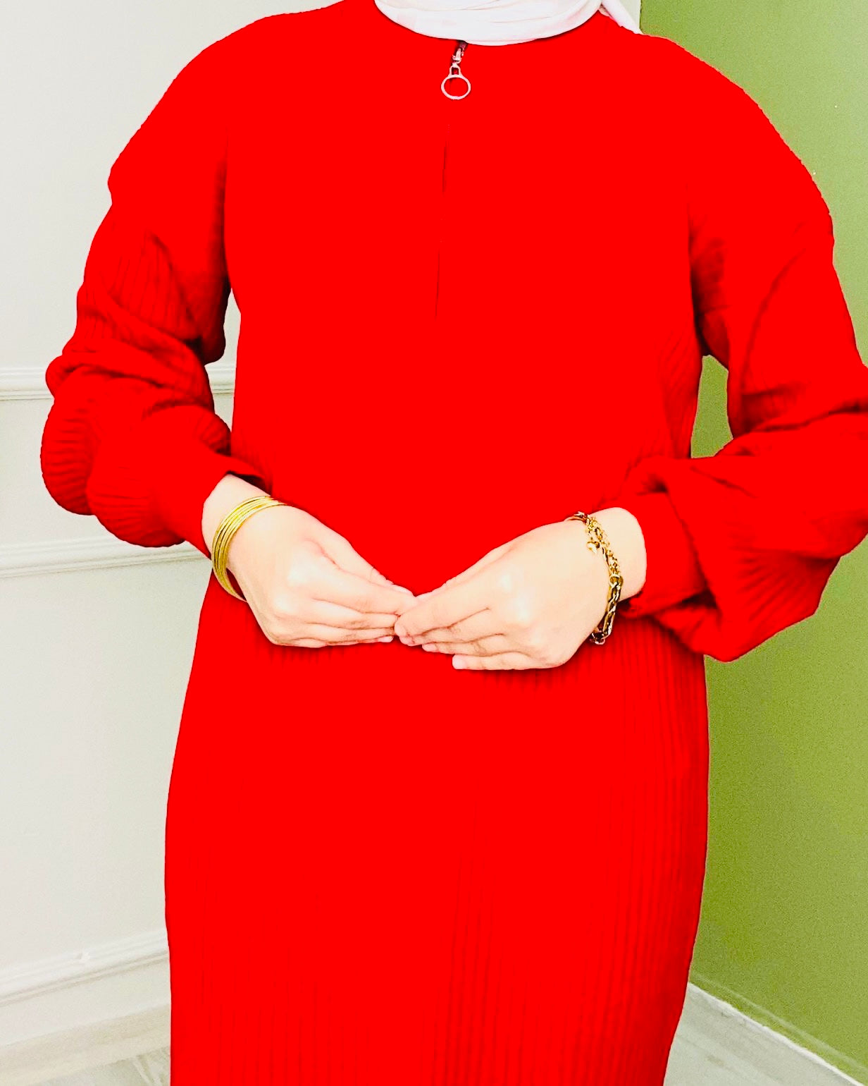 Yarım Boğaz Fermuarlı Triko Elbise Kırmızı