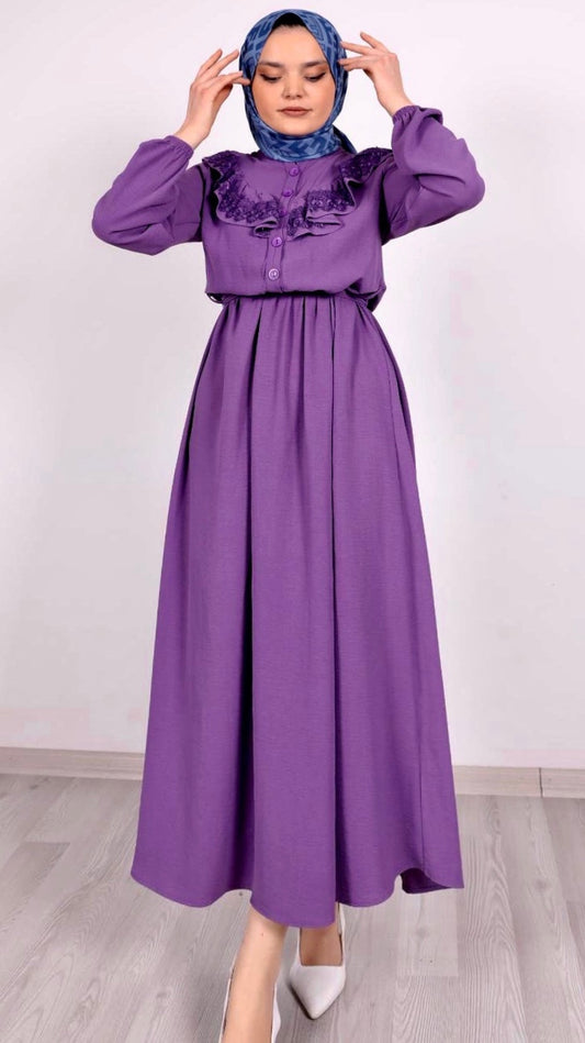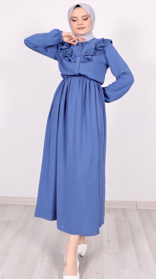 Dantel Detaylı Fırfırlı Elbise Mavi