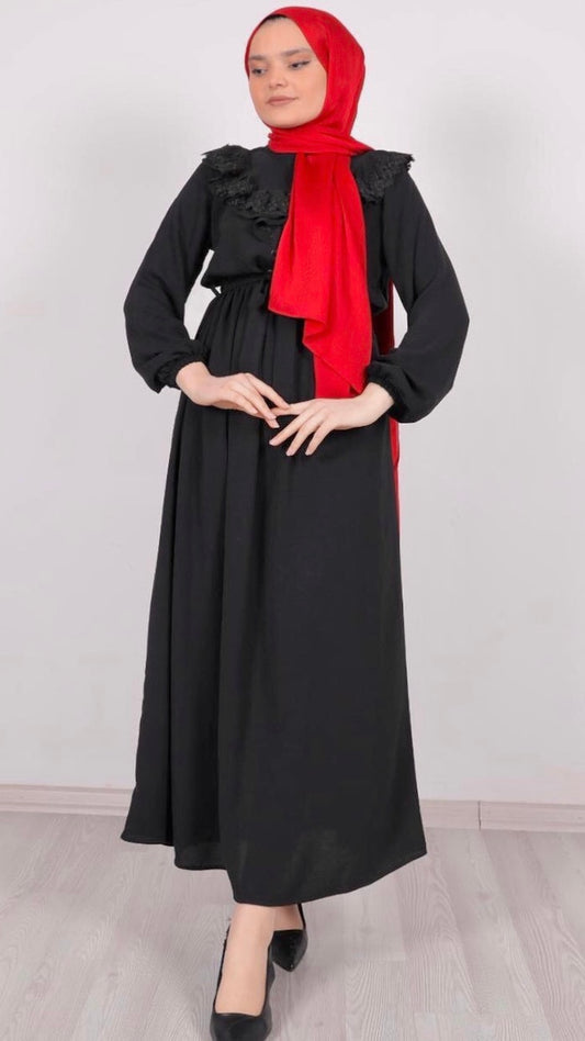 Dantel Detaylı Fırfırlı Elbise Siyah
