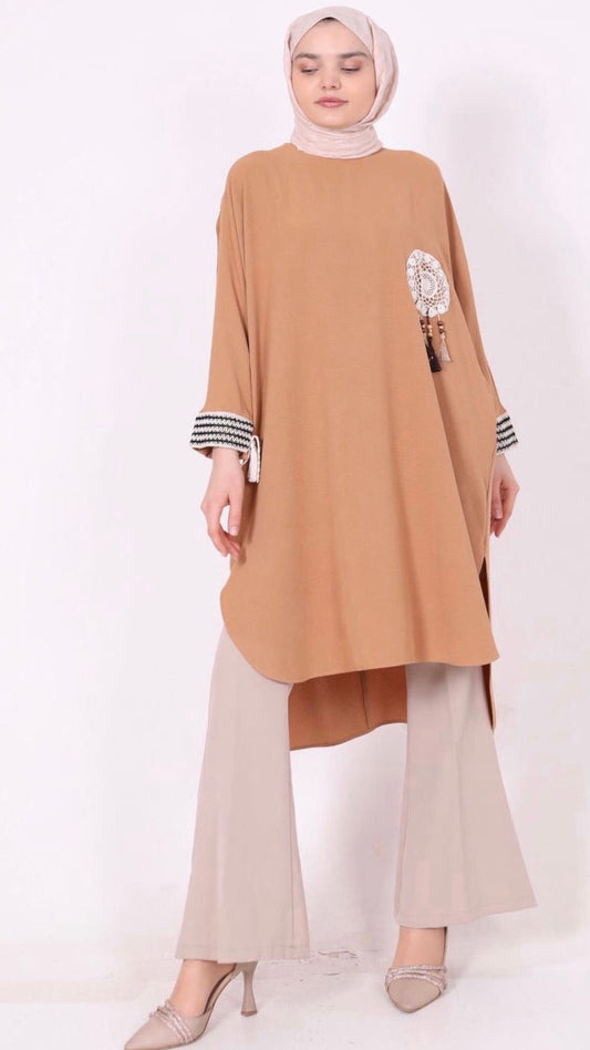 Dantel İşlemeli Püskül Detaylı Uzun Tunik Camel