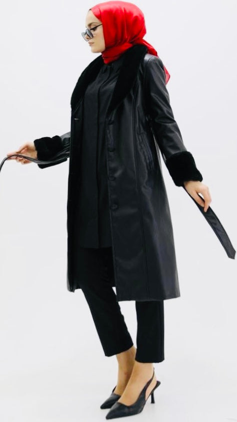 Kolu ve Yakası Kürklü Deri Kap Siyah