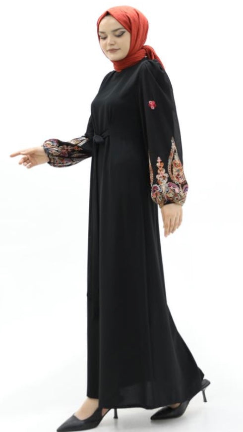 Kolu Nakışlı Belden Bağlamalı Krep Elbise