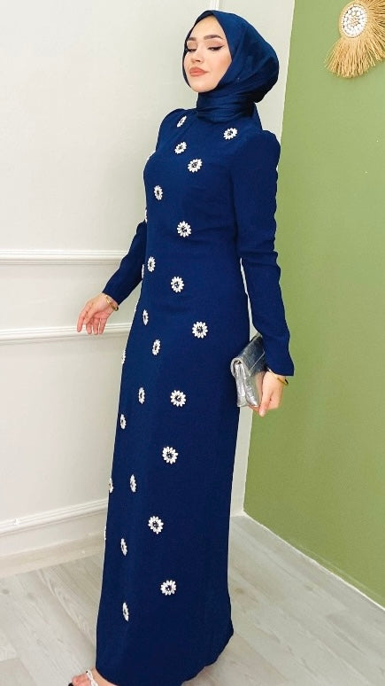 Krep Kumaş Papatya İşlemeli Abiye Lacivert