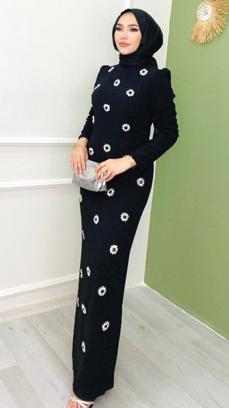 Krep Kumaş Papatya İşlemeli Abiye Siyah