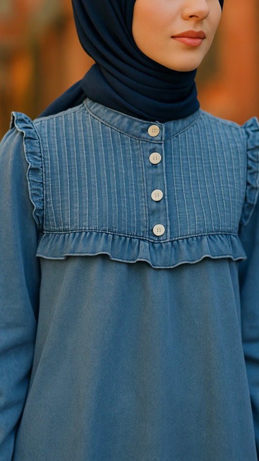 Önü Fırfırlı Yakası Çıtçıtlı Pantolonlu Kot Takım Mavi