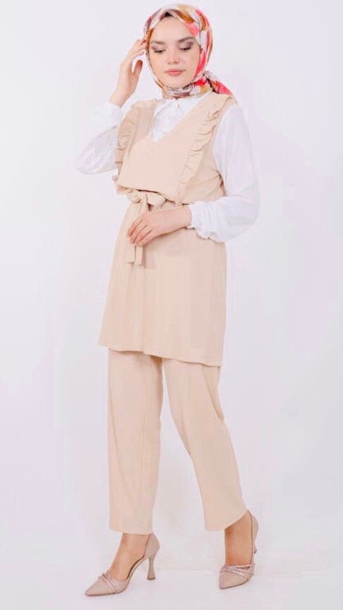 Frilly Front Shirt Detailed Suit Beige