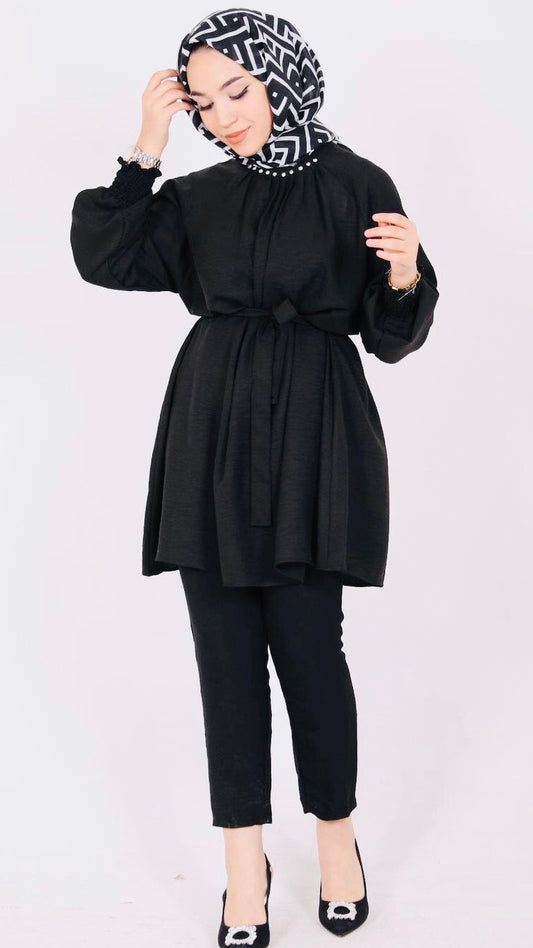 Yakası Taşlı Kuşaklı İkili Takım Siyah