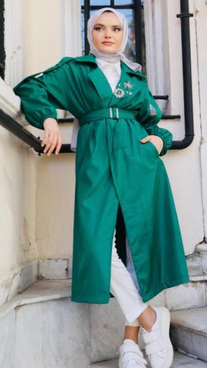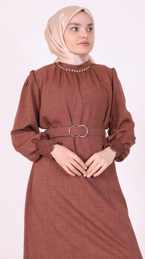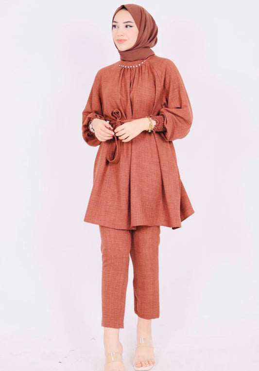 Yakası Taşlı Kuşaklı İkili Takım Kahve