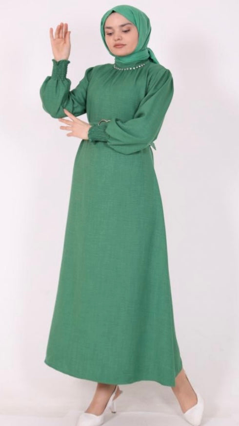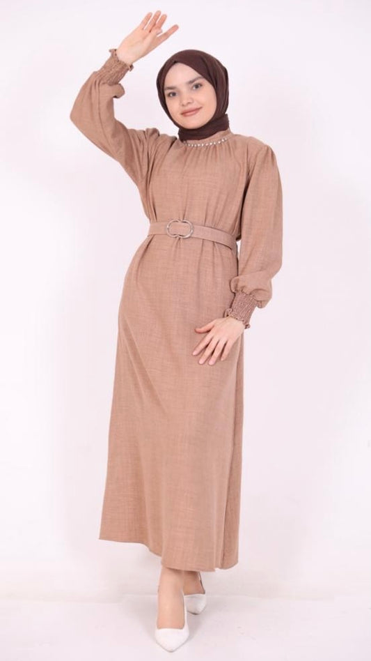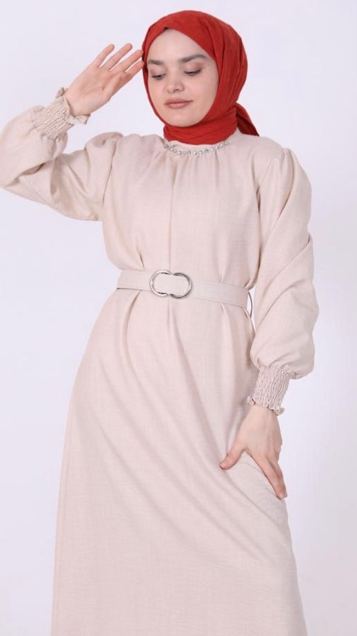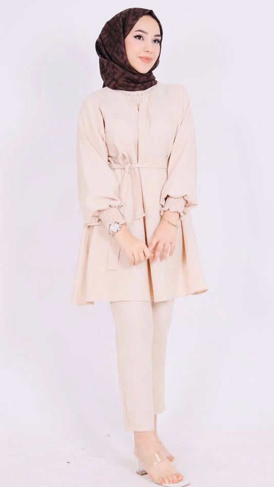 Yakası Taşlı Kuşaklı İkili Takım Bej