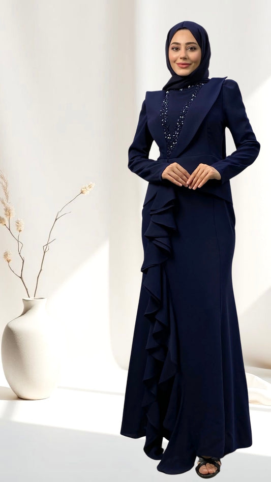 Yan Fırfırlı Taş Detaylı Elbise Lacivert