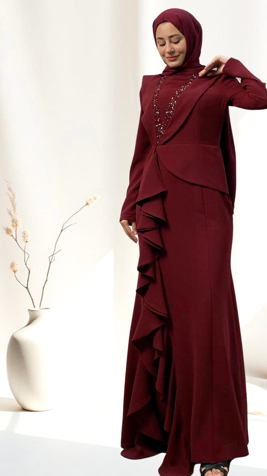 Yan Fırfırlı Taş Detaylı Elbise Bordo