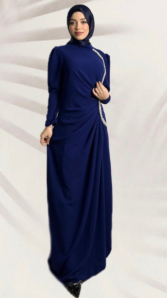 Yan Taş Detaylı Büzgülü Abiye Lacivert