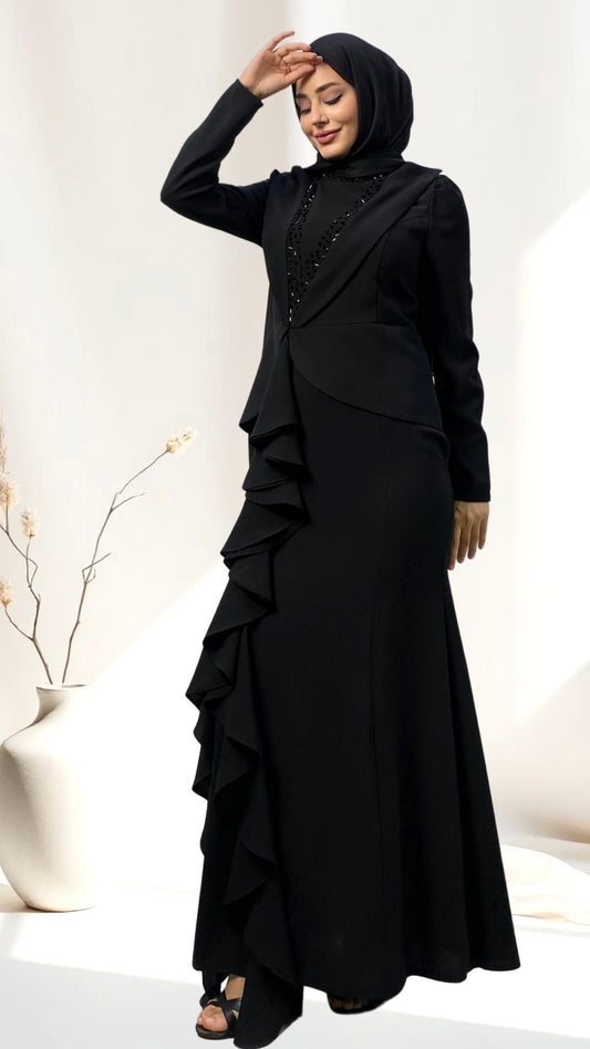 Yan Fırfırlı Taş Detaylı Elbise Siyah