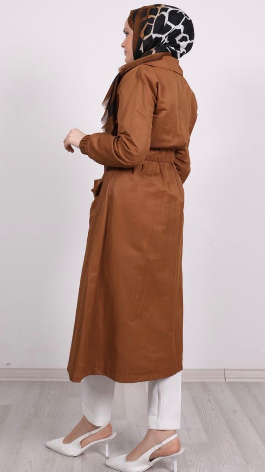 Omzu Düğme ve Beli Kuşaklı Trenç Camel