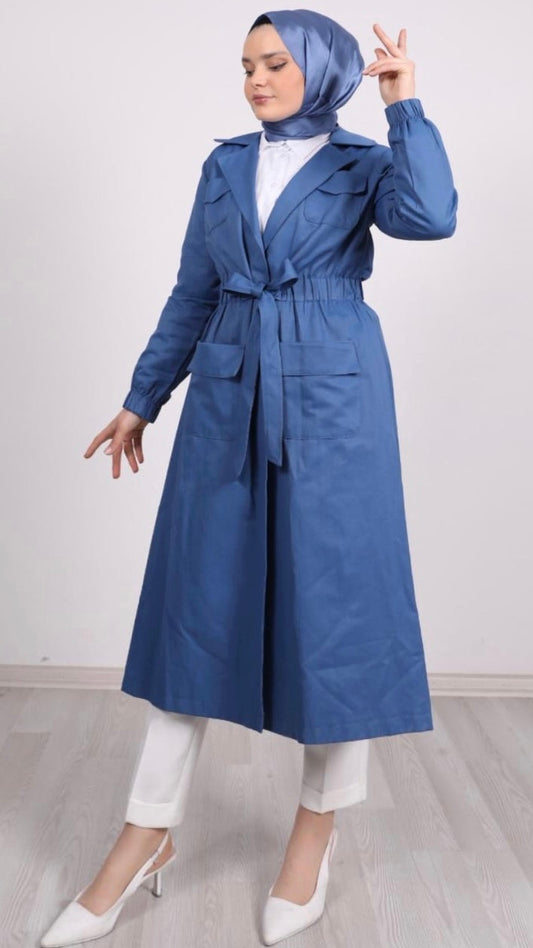 Omzu Düğme ve Beli Kuşaklı Trenç Mavi